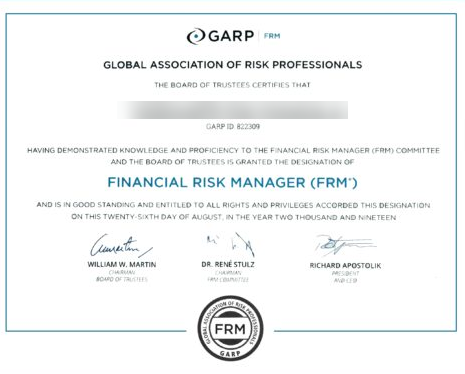 FRM مخفف عبارت Financial Risk Management به معنی مدیریت ریسک مالی می باشد. موسسه صادر کننده این مدرک Global Association of Risk Professionals می باشد که مرکز اصلی آن واقع در کشور آمریکا اسـت. این یک مدرک معتبر در سطح بین المللی است و داشتن آن بیشتر برای افرادی که در موسسات مالی مانند بانک ها و شرکت های بیمه فعالیت می کنند توصیه می شود.